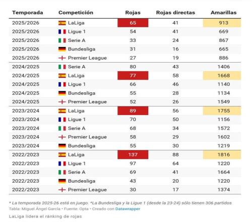 報(bào)道稱,西甲有些賽季逐漸偏離正軌,有些則幾乎毫無征兆地急轉(zhuǎn)直下——本賽季西甲顯然屬于后者。賽程尚未過半,聯(lián)賽紅牌數(shù)已突破60大關(guān)。截至當(dāng)前,219場比賽共出示65張紅牌,此數(shù)字不僅高居歐洲五大聯(lián)賽之首,更預(yù)示著本賽季最終數(shù)據(jù)將顯著高于往常水平。