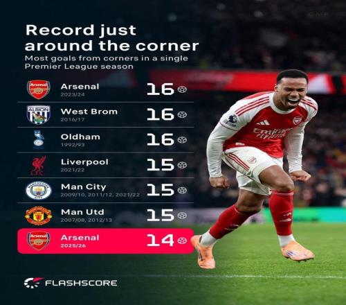 目前,阿森納只需再打進2粒角球進球,就能追平這一項由他們創(chuàng)造的聯(lián)賽紀(jì)錄。