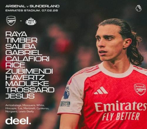 阿森納首發:1-拉亞、12-廷貝爾、2-薩利巴、6-加布里埃爾、33-卡拉菲奧里、41-賴斯、36-蘇比門迪、29-哈弗茨、20-馬杜埃凱、19-特羅薩德、9-熱蘇斯