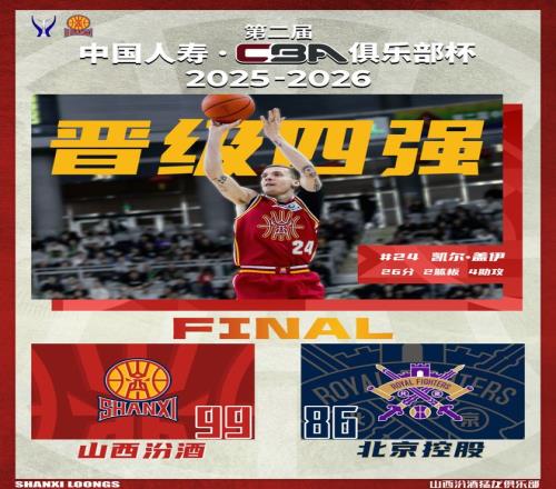 北京時間2026年2月7日19:30,第二屆中國人壽·CBA俱樂部杯決賽階段繼續進行,山西汾酒在伊泰·呼和浩特內蒙古體育館,迎來與北京控股的1/4決賽對決。本場比賽,山西隊上半場處理球急躁,防守端出現太多無畏的犯規,中場調整后,全隊在攻防兩端均有明顯改善,進攻明確,防守積極,并且在末節展現出足夠韌勁,最終取得勝利,全場比賽結束,山西汾酒99:86戰勝北京控股,成功晉級四強。