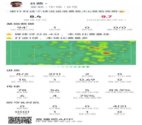 B費(fèi)本場(chǎng)數(shù)據(jù):1粒進(jìn)球,8射2正,5次關(guān)鍵傳球,評(píng)分8.4分