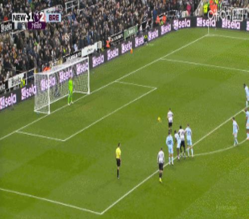 第45分鐘,墨菲禁區手球,蒂亞戈主罰打進,紐卡1-2布倫特福德