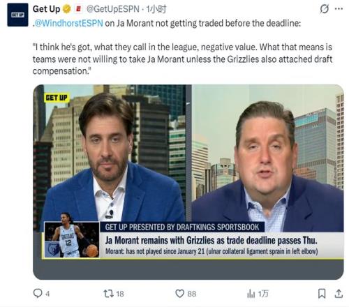 “很多人都說莫蘭特毫無價值,但我覺得這個說法并不準確。”ESPN名記布萊恩·溫德霍斯特在節(jié)目中的話語頓了頓,“因為我認為他現(xiàn)在就是負資產(chǎn),除非灰熊倒貼選秀權(quán),否則沒有球隊愿意接手。”這句冷酷到極致的評價,為賈·莫蘭特的交易鬧劇畫上了一個令人唏噓的休止符。