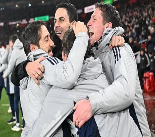 主帥阿爾特塔同樣情緒激動,他與教練團隊緊緊相擁,沉浸在執教阿森納以來第二次闖入決賽的喜悅之中。