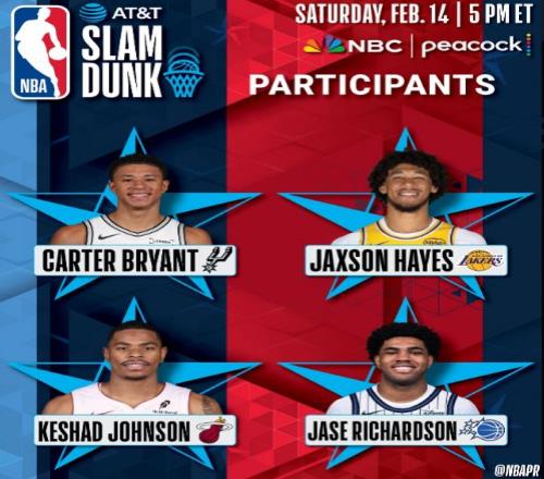 魔術新秀、兩屆扣籃王杰森-理查德森之子賈斯-理查德森,頂替傷退的杜倫參加扣籃大賽,其余3位參賽選手是湖人中鋒海斯,以及熱火前鋒凱沙德-約翰遜與馬刺新秀布萊恩特。