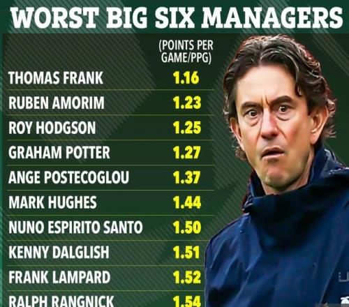 《太陽報》指出,托馬斯-弗蘭克是英超歷史上BIG6豪門里戰績最差的正式主教練,場均僅1.16分,已經比阿莫林還少。