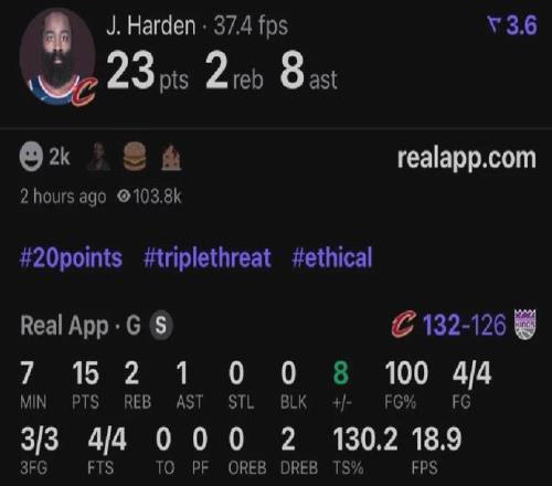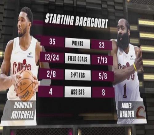 哈登騎士首秀先抑后揚,上半場6中1,下半場7中6包括關鍵時刻連續轟進兩記三分球,最終全場出戰約32分鐘,投籃13中7(三分8中5),罰球4中4貢獻23分2板8助1斷,帶隊132-126擊敗國王。
