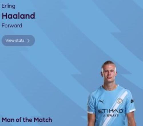 最終經過英超官網球迷投票,哈蘭德以65%的得票率當選全場最佳球員。