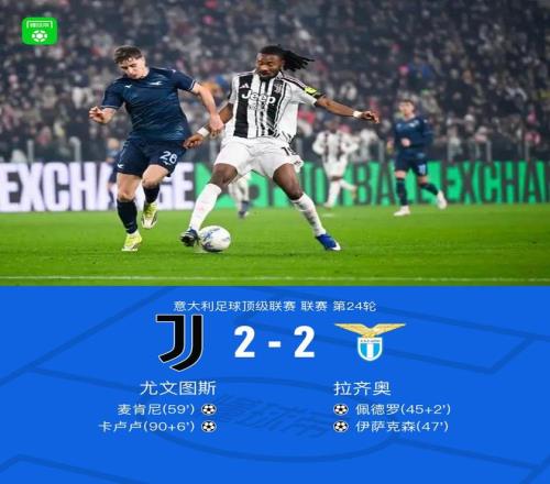 北京時間2月9日意大利足球頂級聯賽第24輪,尤文圖斯主場對陣拉齊奧。 上半場佩德羅抽射變線破門,庫普梅納斯破門被吹,下半場伊薩克森擴大比分,麥肯尼扳回一球,卡盧盧絕平比分。最終尤文圖斯與拉齊奧戰成2-2平。
