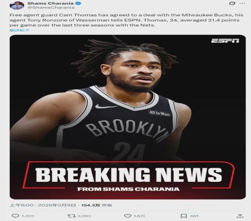 北京時間2月9日上午,據NBA名記Shams報道,自由球員卡梅倫-托馬斯已經正式簽約雄鹿。托馬斯也是目前NBA買斷市場最大牌球員!交易截止日之前,雄鹿將科爾-安東尼和科菲送到太陽,托馬斯相當于頂替科爾-安東尼的位置。