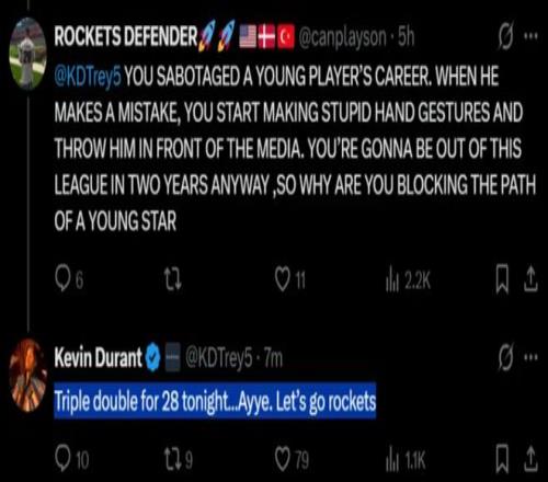 杜蘭特回復:但申京這場拿到三雙(對陣雷霆),火箭,加油。