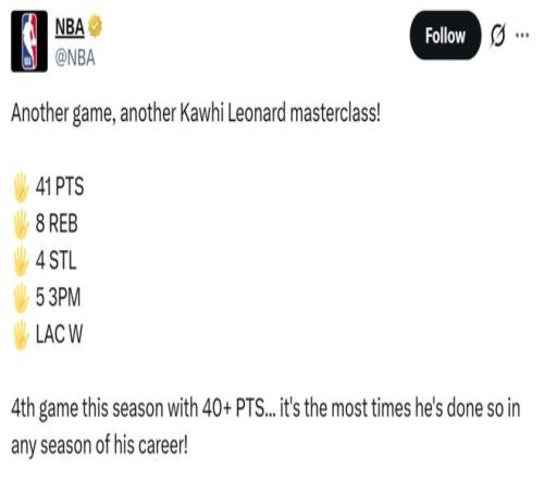 同時本場是小卡本賽季第4次單場轟下40+得分表現,同樣創其個人生涯新高。