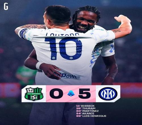 今天凌晨,國(guó)米在意甲第24輪客場(chǎng)挑戰(zhàn)薩索洛。上半場(chǎng),比塞克頭球首開紀(jì)錄,小圖拉姆擴(kuò)大比分,國(guó)米2:0領(lǐng)先。下半場(chǎng),勞塔羅和阿坎吉3分鐘內(nèi)頭頂腳踢將比分?jǐn)U大到4:0,恩里克在終場(chǎng)前抽射破門,最終國(guó)米客場(chǎng)取得5:0大勝!