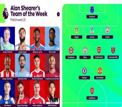 希勒評英超第25輪最佳陣:B席、格伊、B費、帕爾默、哲凱在列