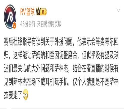 關(guān)于薩林杰的去留問題,杜鋒并沒有談,不過有媒體爆料,廣東宏遠(yuǎn)可能會裁掉薩林杰。