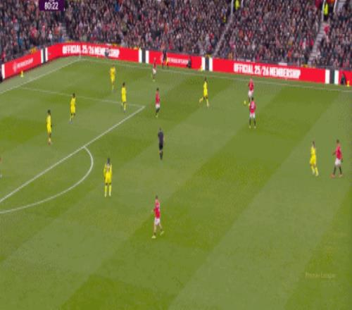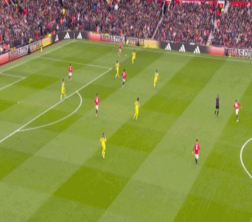 這顯然是嚴格遵循三后衛站位的阿莫林時代不會出現的,更不是約羅打在馬奎爾身側時會常規出現的內容。