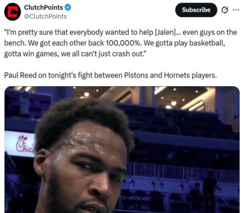 活塞里德則坦言:“我確信每個人都想上去幫忙,甚至包括板凳席上的隊友,我們100000%支持彼此。”