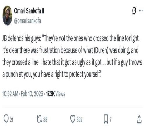 活塞主帥比克斯塔夫賽后表示:“很顯然,越界的不是我們,是他們先因為杜倫的表現而感到沮喪,然后跨過了紅線,才讓事情發展的如此難堪,我討厭這樣,但如果有人向你揮拳,你當然有權自衛。”