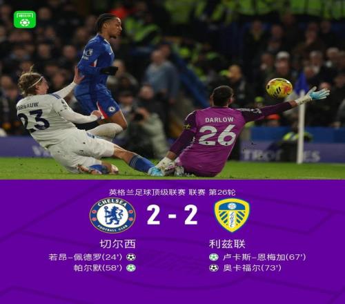 北京時間2月11日英格蘭足球頂級聯賽第26輪,切爾西主場對陣利茲聯。上半場,帕爾默助攻,佩德羅挑射破門。下半場,佩德羅造點,帕爾默主罰命中,隨后,利茲聯連入兩球,扳平比分,恩梅加點射破門,奧卡福爾推射建功。最終比分切爾西 2-2 利茲聯。