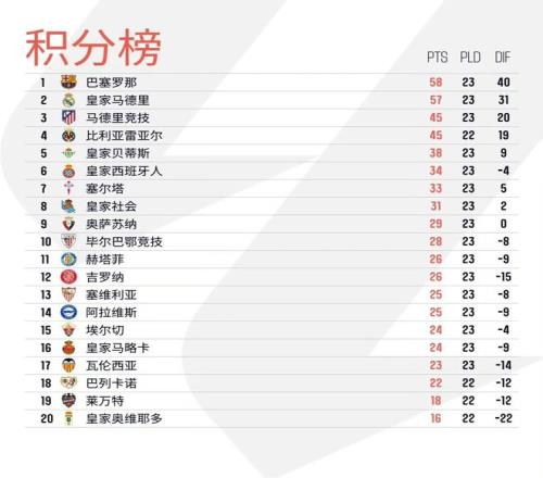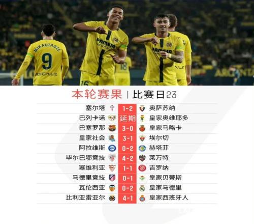 隨著今日凌晨比利亞雷亞爾4比1大勝西班牙人,除開巴列卡諾對陣皇家奧維耶多的比賽延期外,西甲第23輪的其余九場比賽全部戰罷。積分榜方面,巴塞羅那、皇家馬德里雙雙取勝,前者仍然以1分優勢領跑西甲聯賽;馬競本輪0比1不敵皇家貝蒂斯,盡管多賽一場,但積分已被身后的比利亞雷亞爾追平,皇家貝蒂斯則緊隨其后、位列歐聯區。