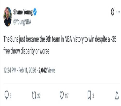 這讓太陽隊(duì)成為NBA歷史上第9支在單場罰球數(shù)比對手少35+情況下,還能拿下勝利的球隊(duì)。