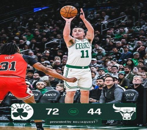 次節(jié)比賽,凱爾特人連續(xù)兩節(jié)單節(jié)得分35+,且用出色防守限制公牛首次單節(jié)不足20分。凱爾特人持續(xù)攻防碾壓公牛,率先打出一波21-6攻勢,已經(jīng)擴大57-33領(lǐng)先24分優(yōu)勢。凱爾特人之后繼續(xù)擴大70-41領(lǐng)先優(yōu)勢,公牛略有反撲追分,上半場結(jié)束凱爾特人擴大72-44領(lǐng)先公牛28分優(yōu)勢。前兩節(jié)比賽,凱爾特人48中28接近6成準星,其中三分19中10,布朗18分、普里查德16分與武切維奇10+6;公牛三分17中6,全隊沒有球員得分上雙。