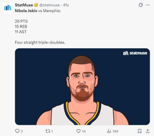 全場比賽約基奇34分鐘,17中8,罰球14中10,拿到26分15籃板11助攻2犯規9失誤,命中率47.1%,正負值+8,約基奇連續四場比賽完成三雙。