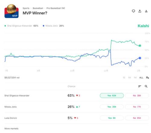 這場比賽后約基奇的MVP概率提升7%升至26%,而亞歷山大下滑63%還是第一,如果約基奇要跟SGA去競爭MVP,掘金余下的27場比賽他需要出戰26場,因為聯盟的評獎規則是至少出戰65場比賽,約基奇再缺席一場就是最少的出戰場次65場。