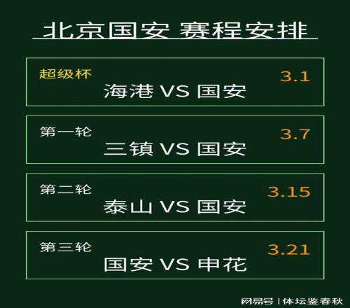 而新賽季聯賽賽程也陸續在網上傳開,看完前三輪對陣的形勢,不少球迷第一反應是強度真不低。3月7日,國安在客場對陣武漢三鎮,3月15日再到客場挑戰山東泰山,3月21日回到主場迎戰上海申花。再算上超級杯面對海港,新賽季的前四場比賽就是硬仗。