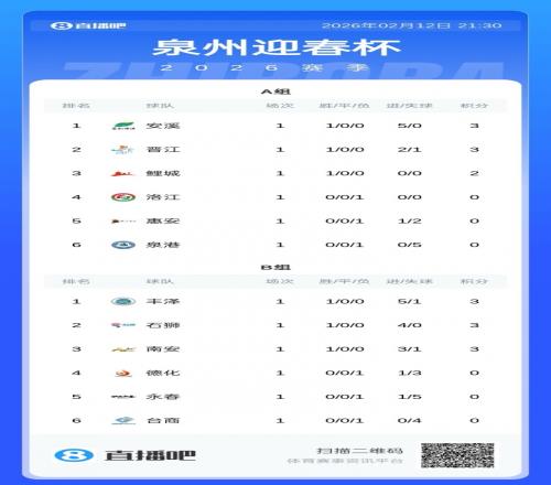 體育播報02月12日宣 2026泉州市首屆“迎春杯”足球聯(lián)賽今晚結(jié)束了3場比賽的角逐,賽果如下。