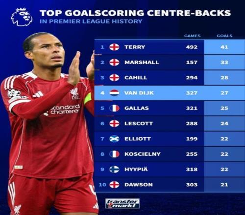 德國(guó)轉(zhuǎn)會(huì)市場(chǎng)統(tǒng)計(jì)了英超歷史上中后衛(wèi)進(jìn)球數(shù)據(jù)排名,約翰·特里41球居首,范戴克27球第四。