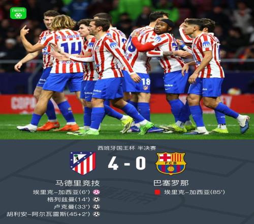 北京時間2月13日西班牙國王杯 半決賽,馬德里競技對陣巴塞羅那。上半場開場不久,埃里克-加西亞回傳,霍安-加西亞將球停進自家球門,隨后,巴薩后防線形同虛設,格列茲曼、盧克曼,阿爾瓦雷斯相繼進球。下半場,埃里克-加西亞放倒單刀機會的巴埃納,裁判出示紅牌將其罰下。最終比分馬競 4-0 巴薩。