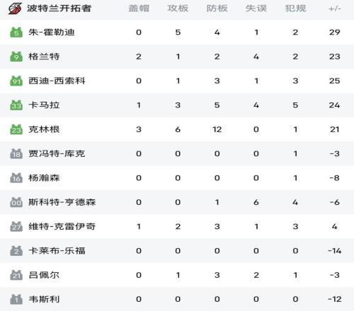 本場比賽,開拓者首發陣容與替補陣容出現嚴重脫節,在大勝爵士16分的情況下,開拓者首發5人正負值均為+20以上,替補席僅有新援克雷伊奇的正負值是正的,其余6人正負值均為負。