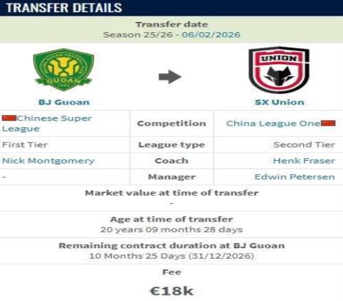 德轉顯示,王宇翔從北京國安加盟陜西聯合的轉會費約15萬人民幣。