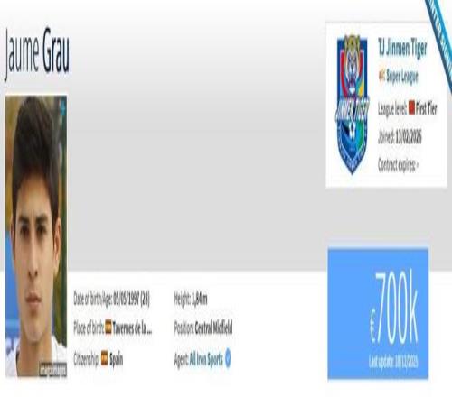 北京時間2月14日,德轉更新,葡超阿維什鎮中場豪梅-格勞加盟天津津門虎。
