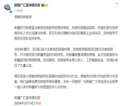 2月13日,新疆廣匯籃球俱樂部發布公告,稱主教練劉煒因身體原因辭職。全文如下: