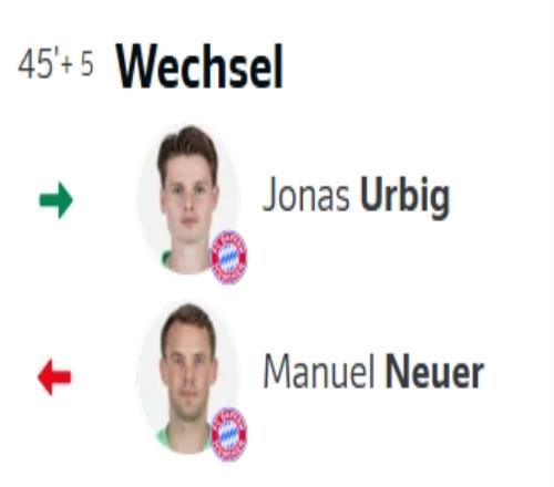 拜仁半場換門將!諾伊爾因小腿輕傷被換下,烏爾比希披掛登場