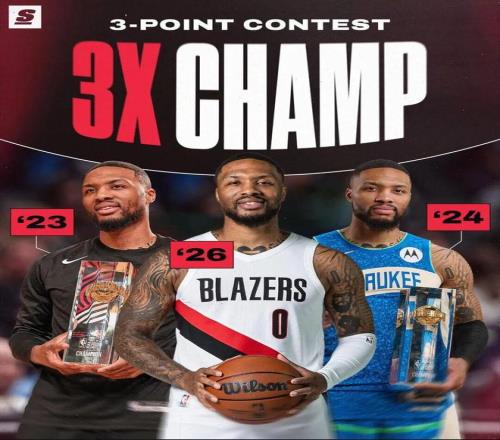 利拉德一把抓起冠軍獎杯,這是他的第三座三分大賽獎杯(2023、2024、2026)。