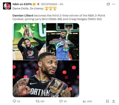 全明星三分大賽,自2025年4月29日被雄鹿官宣跟腱斷裂賽季報銷的利拉德迎來了首秀,他跟布克、克努佩爾三人晉級了三分大賽總決賽,最終利拉德在決賽中獲得29分奪冠,布克在花球中失準遺憾失利,如此一來利拉德拿到了三分大賽三個冠軍。