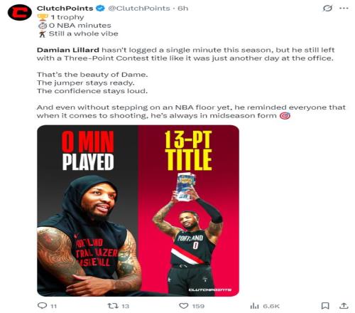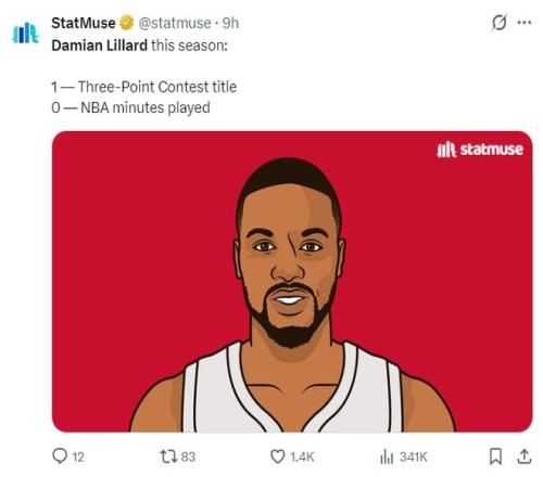 除此之外利拉德還創造了一項NBA歷史首人紀錄,他在本賽季還未出戰過任何一分鐘,卻拿到了三分大賽的冠軍,他是歷史首位做到的NBA球員。