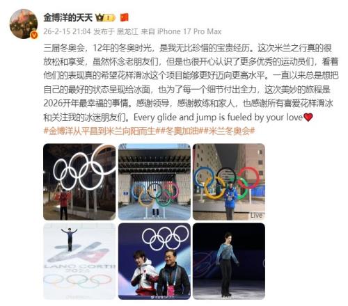 金博洋在社媒中寫道:“三屆冬奧會,12年的冬奧時光,是我無比珍惜的寶貴經歷。這次米蘭之行真的很放松和享受,雖然懷念老朋友們,但是也很開心認識了更多優秀的運動員們,看著他們的表現真的希望花樣滑冰這個項目能夠更好邁向更高水平。一直以來總是想把自己的最好的狀態呈現給冰面,也為了每一個細節付出全力,這次美妙的旅程是2026開年最幸福的事情。感謝領導,感謝教練和家人,也感謝所有喜愛花樣滑冰和關注我的冰迷朋友們。Every glide and jump is fueled by your love(每一次滑行和跳躍都由你的愛驅動)??”