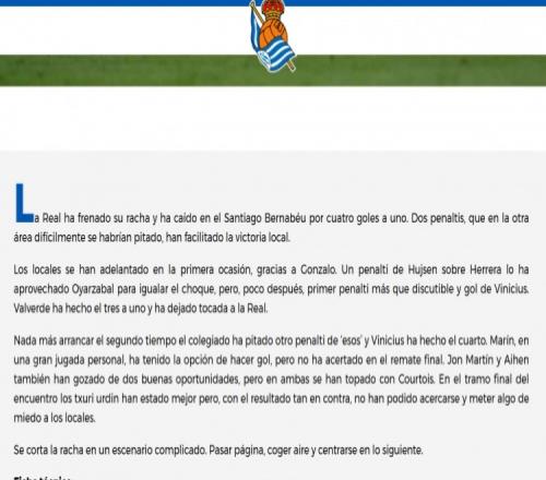 皇家社會被迫中止了良好的勢頭,在伯納烏球場以1-4的比分落敗。兩個點球為這場失利埋下了伏筆,如果同樣的動作發生在另一方的禁區內,恐怕很難被判罰。