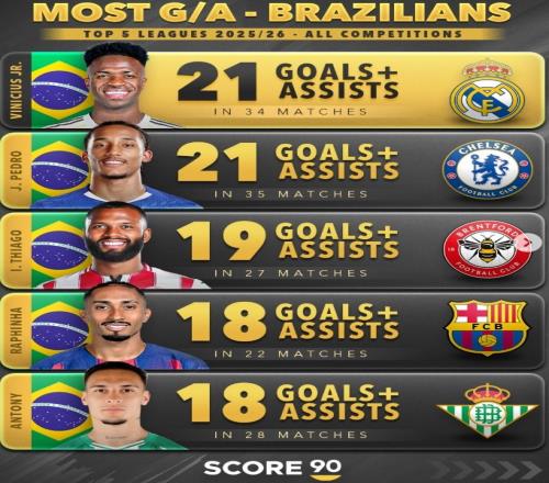 體育播報2月16日宣 數據網站Score90盤點了本賽季五大聯賽球隊巴西球員在各項賽事直接參與進球榜,具體如下(進球+助攻):