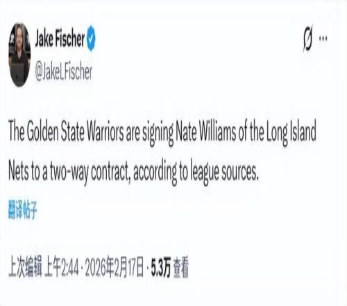 北京時間2月17日,據(jù)NBA名記Fischer報道,勇士將與內(nèi)特-威廉姆斯簽下一份雙向合同。