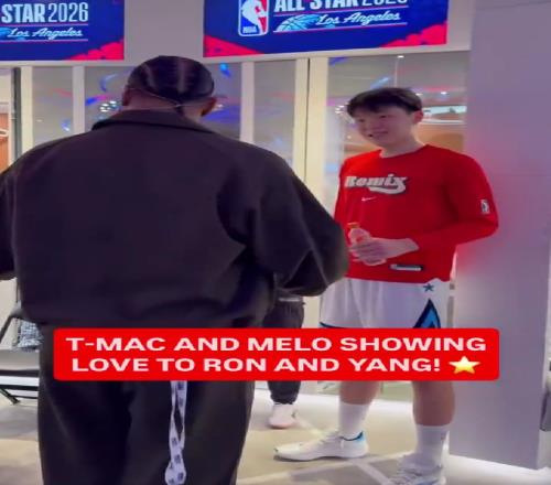 在比賽之前,麥迪、安東尼等NBA傳奇球星來到了新秀更衣室,和聯盟最炙手可熱的新人們打招呼,一身酒紅西裝的麥迪也主動來到了更衣室,和楊瀚森打招呼。