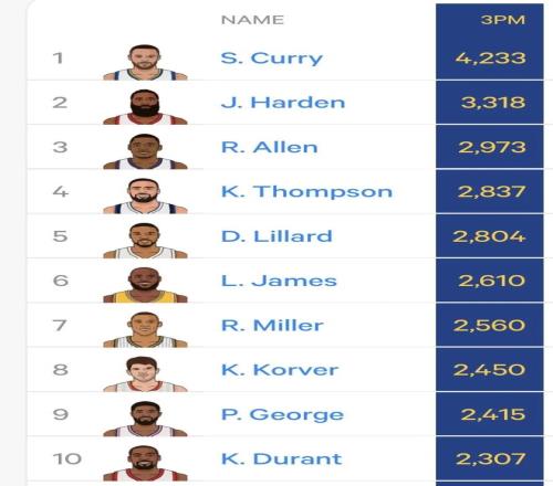 目前的NBA歷史三分榜上,現役球員占了7位,其中前四分別就是庫里、哈登、湯普森、利拉德。