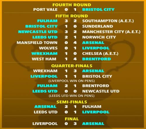 1/4決賽,阿森納3-1淘汰雷克瑟姆,利物浦則通過點球大戰擊敗布里斯托城,富勒姆2-1布倫特福德,利茲聯則依靠點球大戰淘汰紐卡晉級四強。