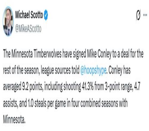 北京時間2月18日,控球后衛邁克-康利已經與森林狼隊重新簽約。這筆交易已出現在NBA官網的官方運作日志中,HoopsHype記者邁克爾-斯科托也證實,雙方已簽約至本賽季結束。