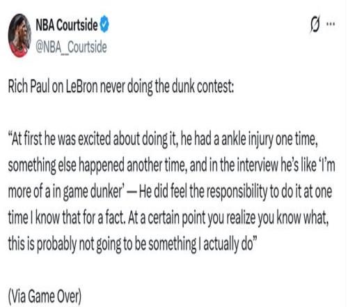 雖然有幾年確實是因為傷病,但在長達23年的職業生涯里,詹姆斯本有大把機會。這位41歲的球星只是選擇不參加,他也曾解釋過,參加扣籃大賽從來都不是他的目標。