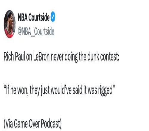 里奇-保羅在自己的《Game Over》播客節目中大膽斷言,如果詹姆斯當年真的參加并贏下扣籃大賽,外界會是什么反應?!叭绻A了,人們只會說比賽是暗箱操作的。”保羅說道。
